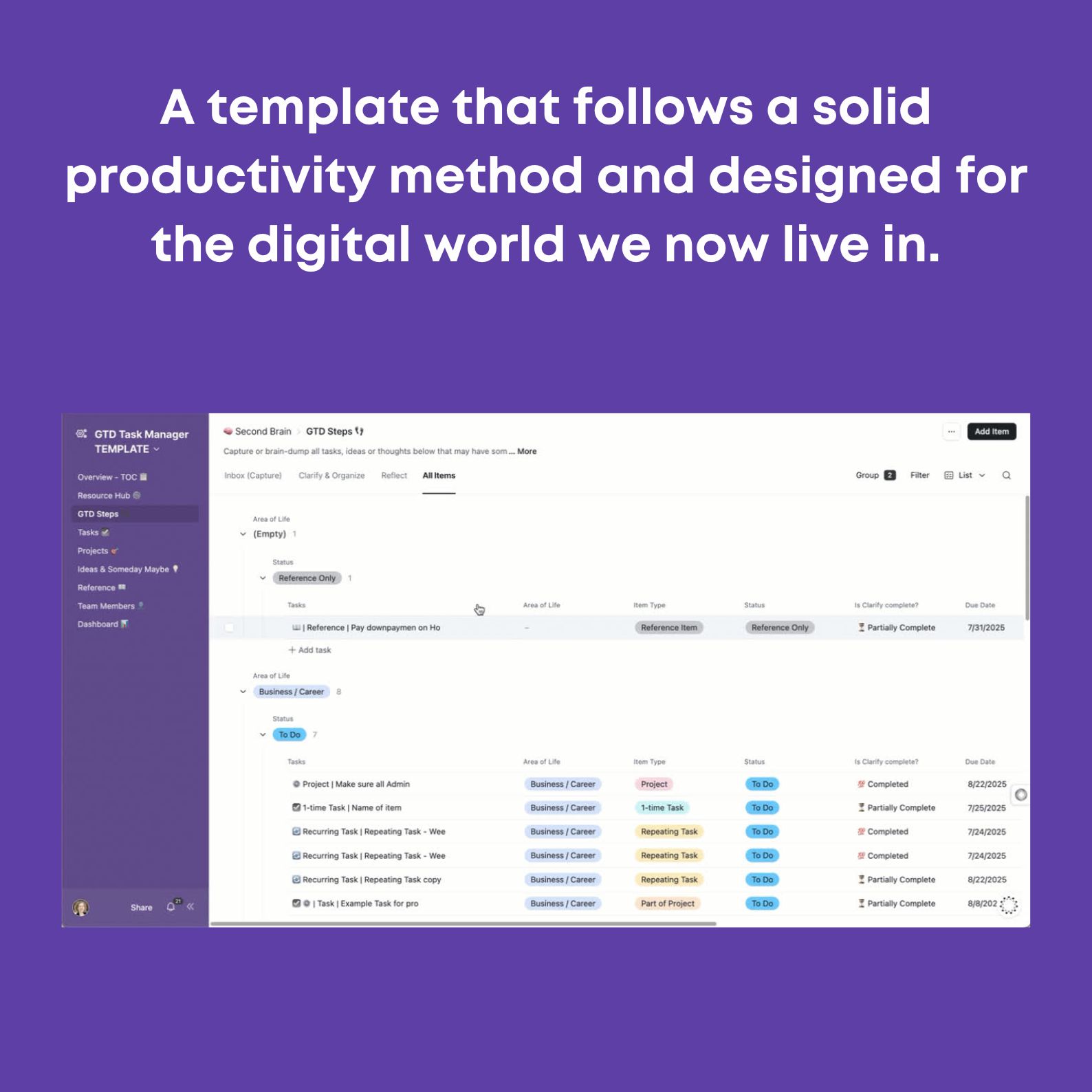 ✅ Pre-built views for Projects, One-Time Tasks, Recurring Tasks, and Someday/Maybe Ideas